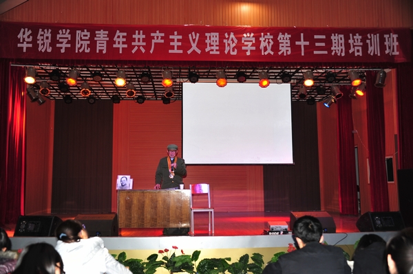 4月7日晚,全国劳动模范提名奖获得者、红色经典宣讲员何志城老先生在大学生活动中心为我院第13期青校学员作报告,院团委副书记胡秀云主持报告会。